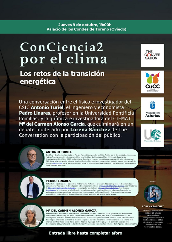 Apunta en tu agenda esta conferencia: Antonio Turiel, Pedro Linares y María del Carmen Alonso García departirán sobre los retos de la transición energética.