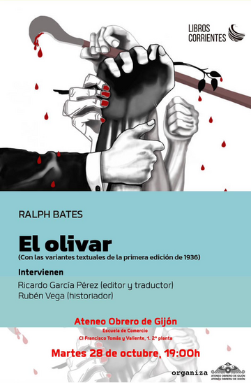El próximo martes 28 de octubre, a las 19H.00', en local social del Ateneo Obrero de Gijón (2ª Planta de la Escuela de Comercio, Cl Francisco Tomás y Valiente, 1), tendrá lugar la presentación del libro El olivar, del que es autor Ralph Bates. La edición y traducción es de Ricardo García Pérez, para la editorial Libros Corrientes.