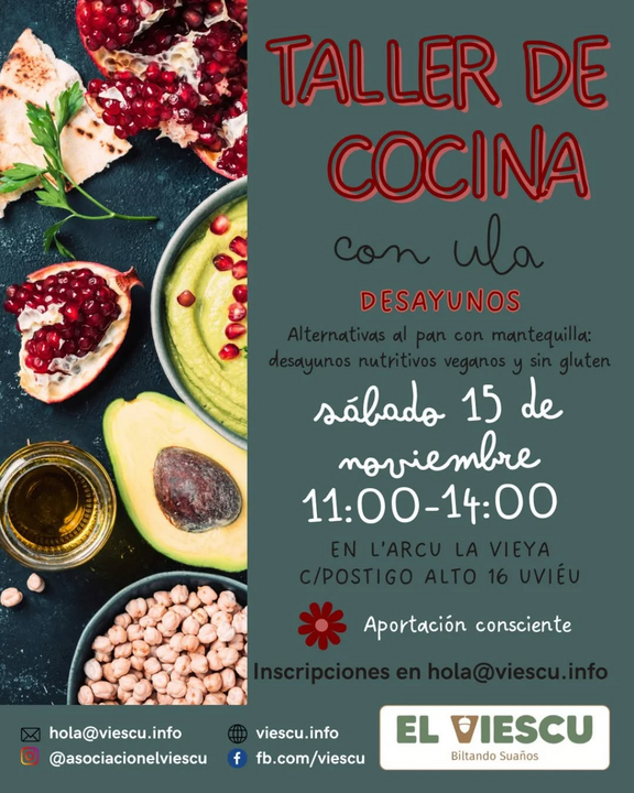 Se abren inscripciones para el próximo taller de cocina que impartirá Ula en L'Arcu la Vieya el sábado 15 de noviembre.