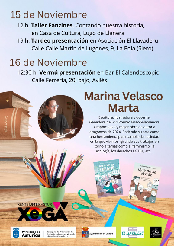 La autora Marina Velasco Marta (@marinandome), hablará de cultura LGTBI+ y memoria, explorando el arte como herramienta de resistencia y comunidad.