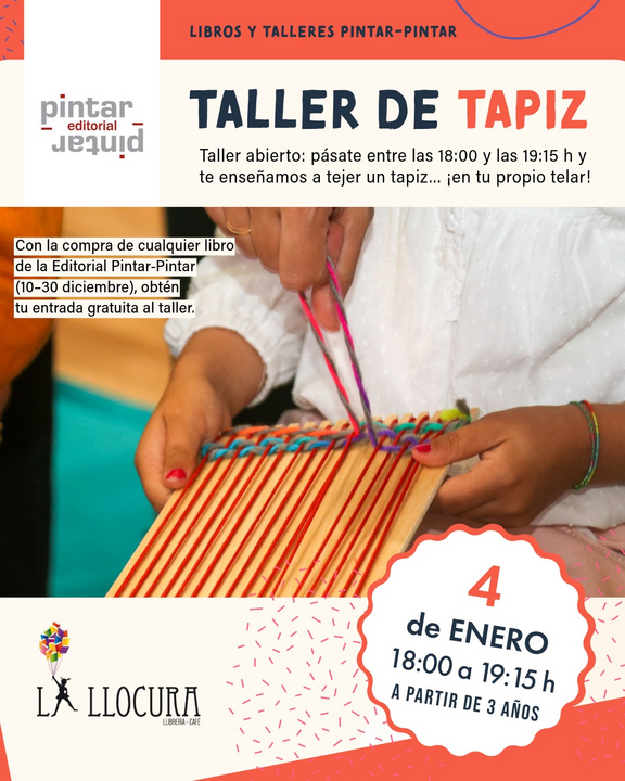 Nos encanta la iniciativa de Pintar-Pintar Editorial: por la compra de cualquiera de sus títulos te regala un taller de tapiz para niños de entre 3 y 103 años, que va a celebrarse aquí, en La Llocura. Y te lo llevas a casa, así que es el mejor regalo para estas navidades. ¡100% hecho a mano y sin consumismo innecesario!