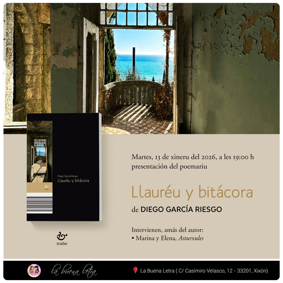 El martes 13 de xineru va presentase a les 19 hores en La Buena Letra 'Llauréu y bitácora', el primer poemariu de Diego García Riesgo, publicáu na nuestra colección Pontiga.