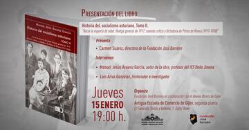 El próximo jueves 15 de enero, a las 19H.00', en local social del Ateneo Obrero de Gijón (2ª Planta de la Escuela de Comercio, Cl Francisco Tomás y Valiente, 1), la Fundación José Barreiro, en colaboración con el Ateneo Obrero de Gijón, presentará el libro Historia del socialismo asturiano, del que es autor Manuel Jesús Álvarez García.