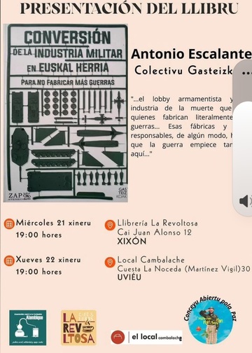 Presentación del llibru Conversión de la industria militar en Euskal Herria, Colectivo Gasteizkoak [Zapateneo, 2024]. Con Antonio Escalante (coautor). Entama: Conceyu Abiertu Pola Paz.
