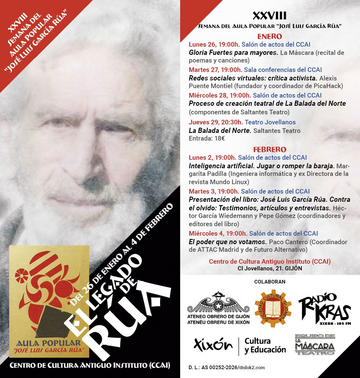 El Centro de Cultura Antiguo Instituto (CCAI) de Xixón acogerá del 26 de enero al 4 de febrero la XXVIII Semana del Aula Popular "José Luis García Rúa", una cita cultural y social que reunirá teatro, pensamiento crítico, literatura y debate político y tecnológico, y que sirve de homenaje al filósofo y militante gijonés, fundador de las Comunas Revolucionarias de Acción Socialista, y más tarde secretario general de la CNT.