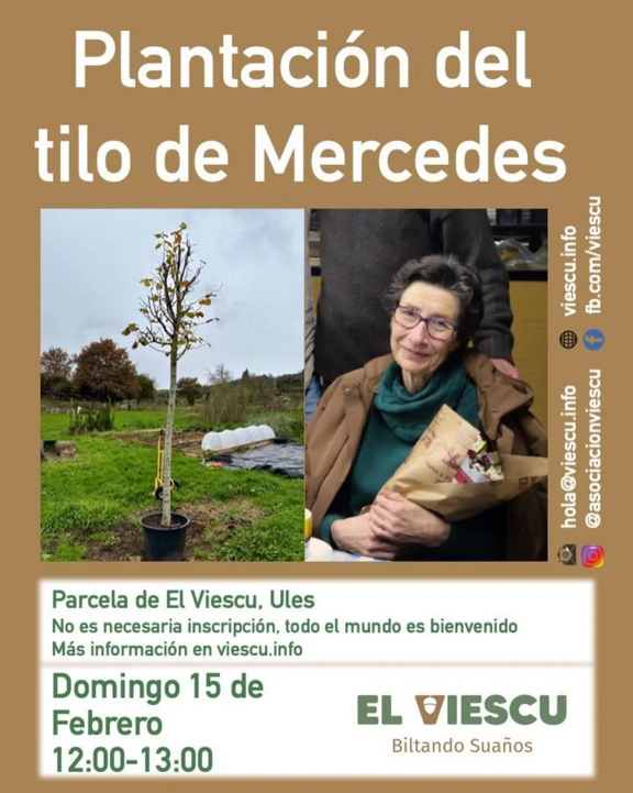 El próximo domingo 15 de febrero a las 12:00 h tenemos una actividad especial: la plantación del tilo de Mercedes, compañera extraordinaria. Todas aquellas personas que tuvieron la suerte de compartir con ella un trocito de este camino que es la vida son bienvenidas a la parcela de la asociación en Ules. No hay programa oficial, quien quiera tendrá la oportunidad de decir unas palabras o contar alguna anécdota recordándola.