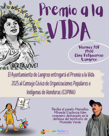 El Ayuntamiento de Langreo entregará el Premio a la Vida 2025 al Consejo Cívico de Organizaciones Populares e Indígenas de Honduras (COPINH), organización fundada por la defensora de derechos humanos Berta Cáceres, asesinada en marzo de 2016.