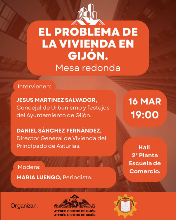 El próximo lunes 16 de marzo, a las 19:00 horas, en el Vestíbulo de la 2ª Planta de la Escuela de Comercio (Cl Francisco Tomás y Valiente, 1), organizada por la Sociedad Cultural Gijonesa y el Ateneo Obrero de Gijón, tendrá lugar una mesa redonda bajo el título El problema de la vivienda en Gijón.