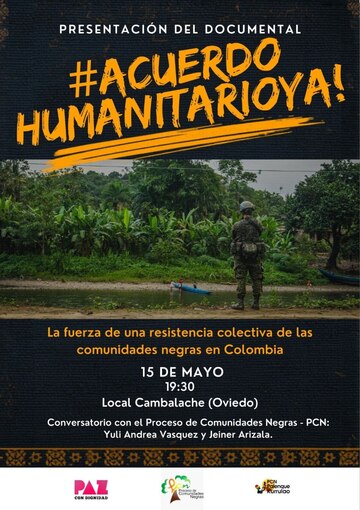 Presentación del documental ¡Acuerdo Humanitario Ya! La fuerza de una resistencia colectiva de las comunidades negras en Colombia. Con Yuli Andrea Vázquez (Palenque Kurrulao - PCN, Colombia), Jeiner Arizala (Proceso de Comunidades Negras - PCN, Colombia) y Eneko Calle (Paz con Dignidad). Organiza: Paz con Dignidad